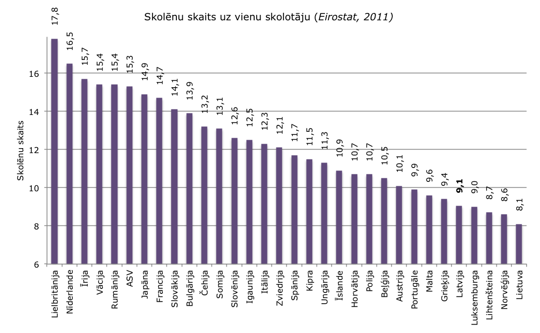 Te var redzēt EUROSTAT datus – viņiem visām valstīm ir vienota metodika. Tur Latvijai 2012. gadā ir 10 skolēnu uz skolotāju: http://appsso.eurostat.ec.europa.eu/nui/show.do?dataset=educ_iste&lang=en