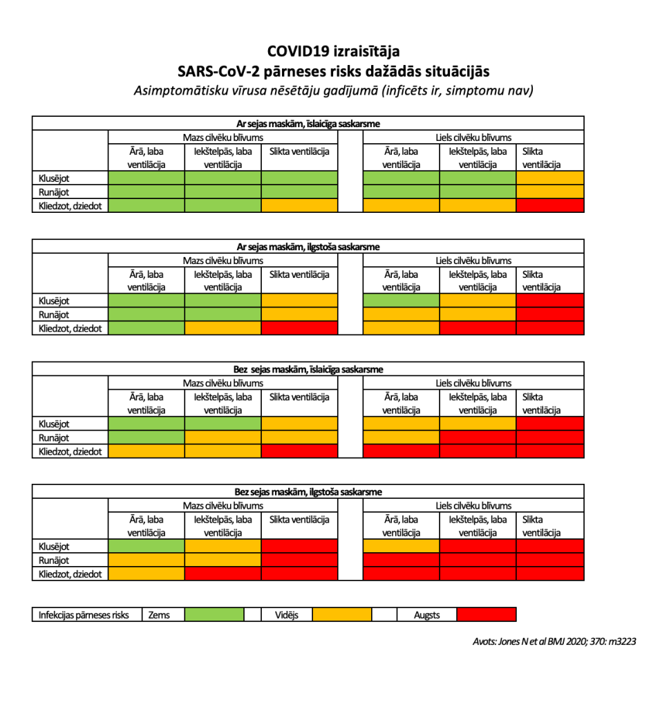 Piemēram, ārtelpās pat pie liela cilvēku blīvuma ir maza iespēja inficēties. Ja lieto maskas un nepieļauj ilgstošu drūzmēšanos, risks ir niecīgs.